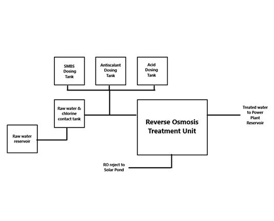 Step 3: 10,000 m3/day of RO treated water is transferred to power plant reservoir through pipeline to be used in the power plant as raw water. The treated water has a total dissolved solid of 200 to 250 PPM, which is equivalent to the fresh raw water received. 5,000 m3/day of RO reject is pumped to the solar pond for natural evaporation.